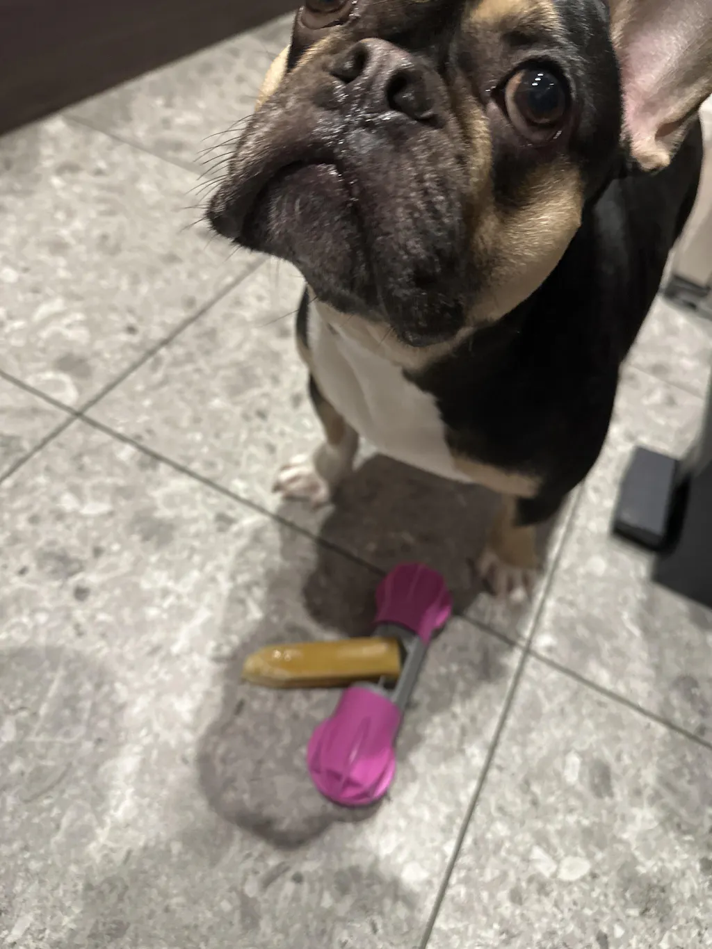 わんちゃんも手で押さえれるのですごく良いです。 ただ、カラーが選べなかった…(ピンクが欲しかったけど緑がきました。)ので残念。 ヤクミルクチーズを押さえた時隙間があるのですが、使い方が合ってるのか少し不安ですが、取れないのでそのまま使います。